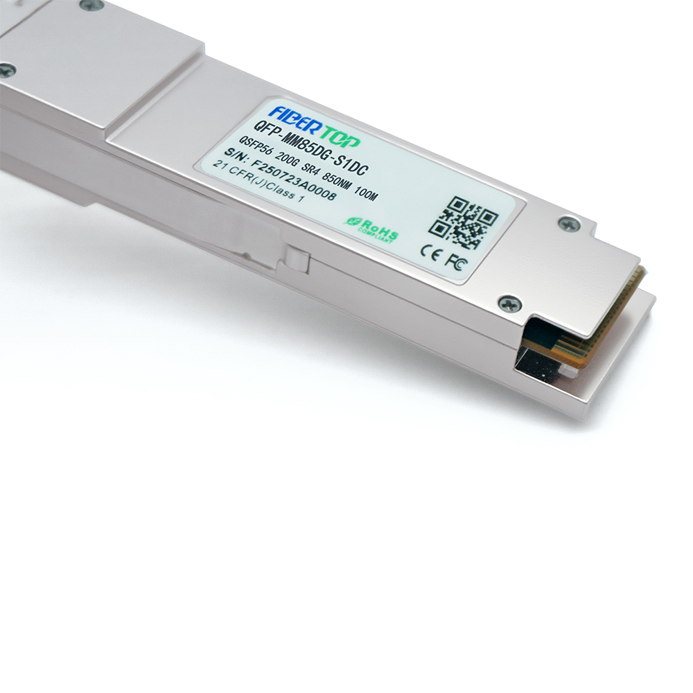 SKU: QFP-MM85DG-S1DC   Product Highlights   Hot Pluggable QSFP56 Transceiver   Supports 212,5Gbps aggregate bit rate   Up to 53.125Gbps data rate per channel   SFF-8665 compliant QSFP56 port;SFF-8636 compliant I2C management   Compliant with IEEE802.3cd 200GBASE-SR4   MPO-12 connector receptacle with UPC end-face   Maximum link length of 100m on OM4 MMF
