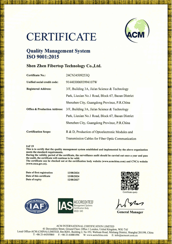 | FIBERTOPSFP has passed the ISO 9001:2015 Quality management systems — Requirements on August 21, 2021 | ||