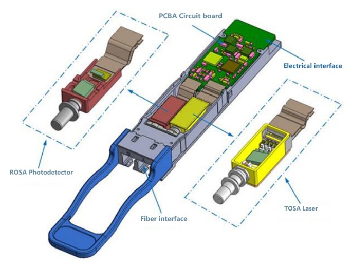 An optical transceiver module, also known as an optical module or transceiver, is a device used in optical communication systems to facilitate the conversion between optical and electrical signals. It typically consists of an optical transmitter and an optical receiver. The optical transmitter converts electrical signals into optical signals and transmits them through optical fibers. At the receiving end, the optical receiver receives the optical signals from the fiber and converts them back into electrical signals for further data processing and transmission.