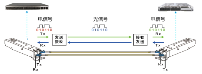 At the transmitting interface, an electrical signal with a specific bit rate is inputted. After undergoing internal processing by the driver chip, the corresponding modulated optical signal is emitted by the driver's semiconductor laser diode (LD) or light-emitting diode (LED) at the appropriate speed. The emitted optical signal is then transmitted through the optical fiber. At the receiving interface, the optical signal is converted back into an electrical signal by the optical detector diode (photodiode) and amplified by a preamplifier before being output as an electrical signal with the corresponding bit rate.
